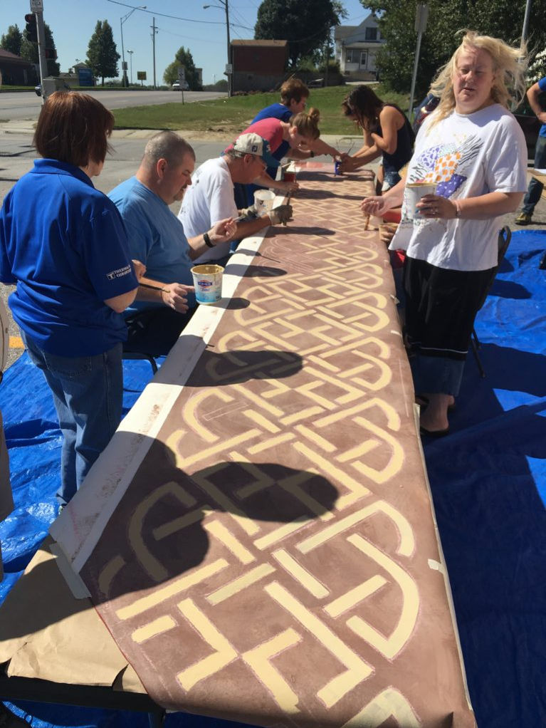 This was our first mural to be completed on Polytab fabric in our studio and then installed onto the wall. This allowed us to paint all through the harsh winter months. We were also able to achieve smoother textures, even brushstrokes, and more detail, because we didn't have to paint directly on to rough bricks. The mural was painted in sections and had to be assembled like a puzzle on site. The fabric is durable and will help preserve parts of the crumbling brick facade on Donohue's Pub.