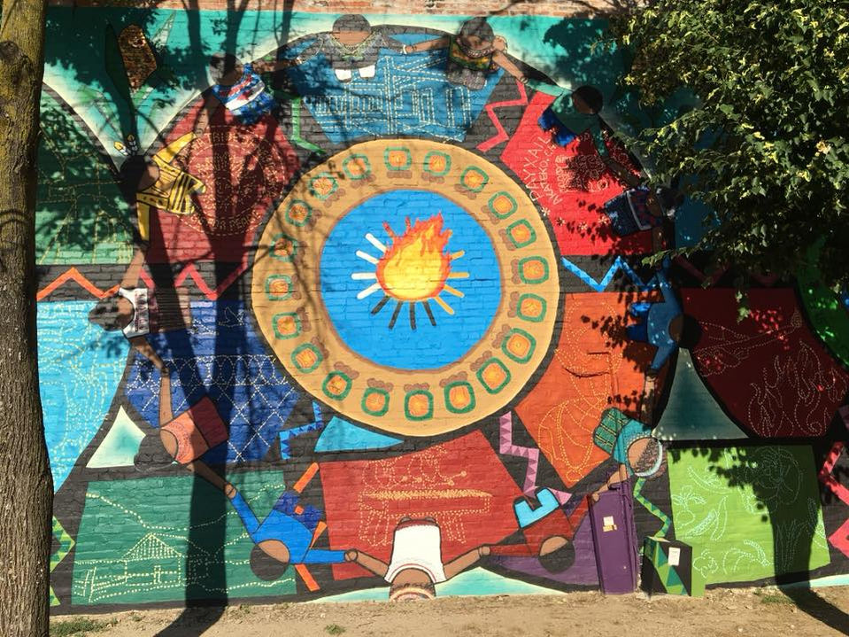 Follow the fabric through three loops: past, present, and future. Within the stitches you can find stories of the sorrow, strength, and hope of the Mayan Community in South Omaha. This mural coincided with the production of “EPIC” a play written by Ellen Struve that tells the story of local teenagers who paint a mural that connects their lives, ancestry, and the sacred Mayan text, the Popol Vuh. Communidad Maya Pixan Ixim helped to write, perform, design, and paint these stories of their indigenous culture and history.