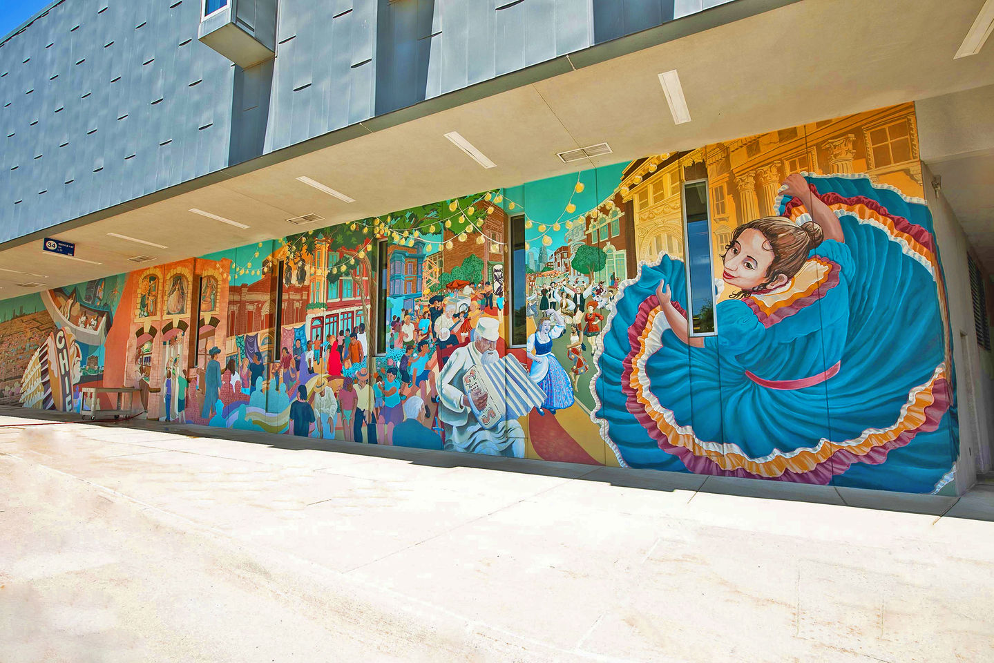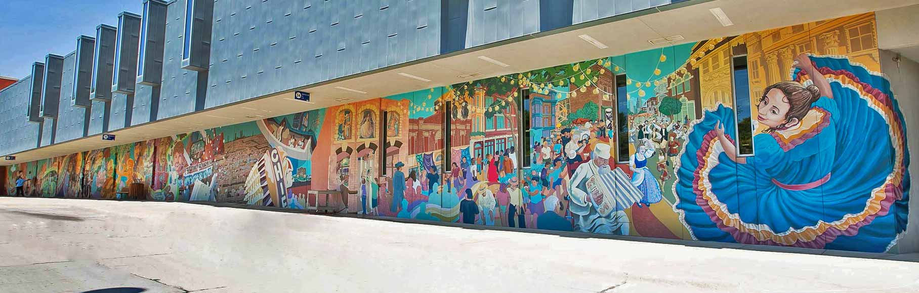 The MCC Mural Project at the South Omaha Campus involved students, instructors, muralists, and historians in depicting the trajectory of South Omaha’s epic history. Many community meetings were held across the area to hear stories and discuss what was important to the residents. Lead artist Mike Girón and assistant artists Rebecca Harrison and Richard Harrison painted with the assistance of 8 students and several community members.